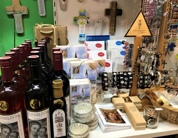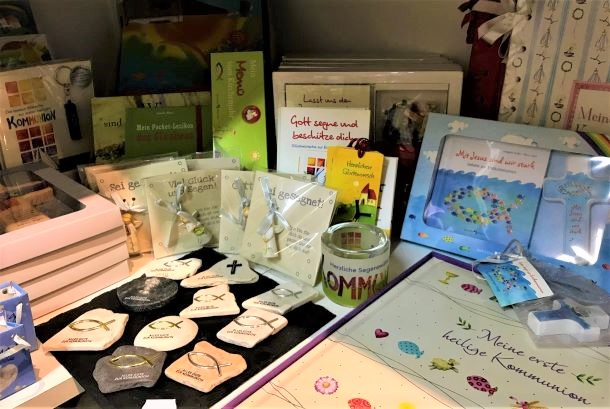 Unser Geschäft befindet sich in unmittelbarer Nähe der Wallfahrtskirche St. Laurentius in Wörth/Isar. Bereits seit 2010 verkaufen wir ehrenamtlich verschiedene Wallfahrtsartikel zur Mutter vom Guten Rat. Dazu gehören unter anderem Rosenkränze, Armbänder, Marienbilder und auch der beliebte Wallfahrtswein in weiß, rose und rot. Abgerundet wird das Sortiment durch die Pralinenauswahl in Buchpackung, mit Pralinen der Confiserie Kunder, sowie das Engellicht und die Schutzengel aus Bronze.