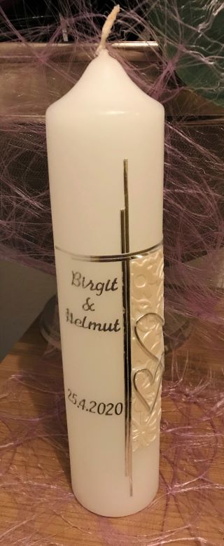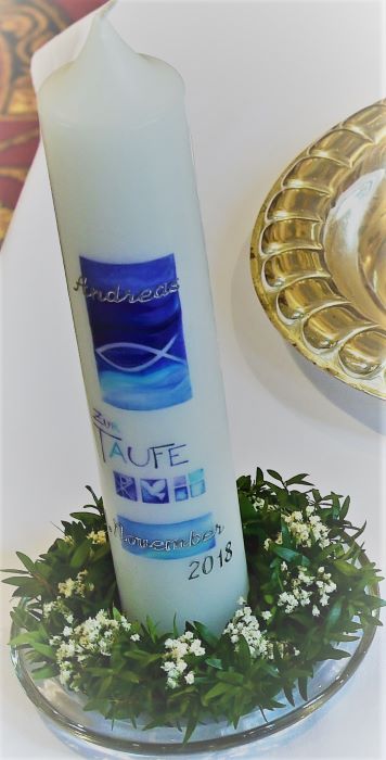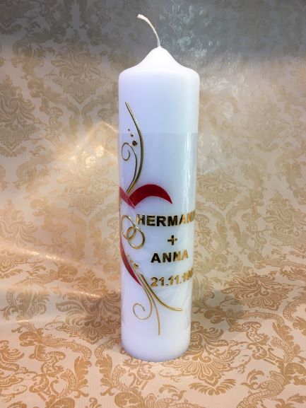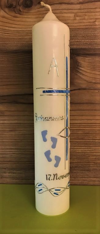 Es gibt sowohl Kerzen mit aufgelegtem Wachsmotiv oder Druckmotiv in verschiedenen Größen. Alle Kerzen lassen sich mit Name(n) und Datum individuell gestalten. Dabei können Sie zwischen Wachs- und Klebebuchstaben und einer Gold- oder Silberschrift wählen.