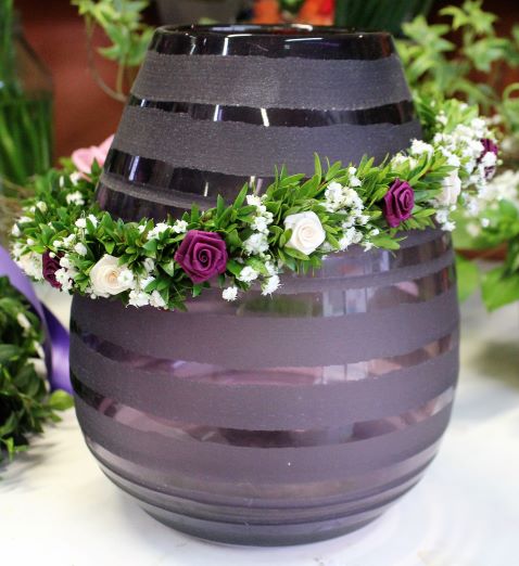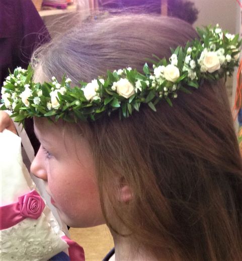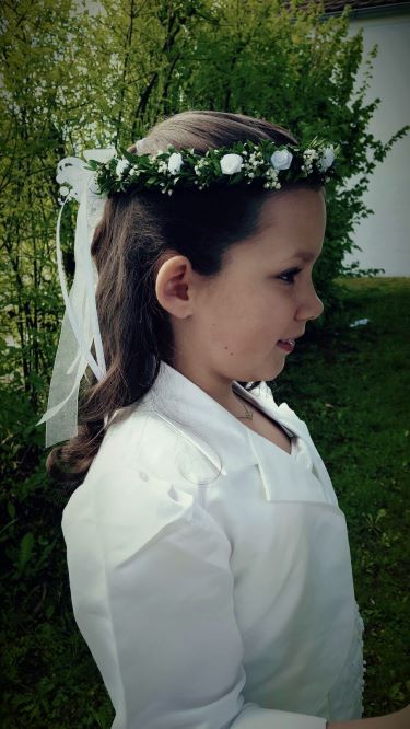 Für den Haarschmuck verwenden wir in der Regel Myrthe in Kombination mit Schleierkraut, Kunstblumen (z.B. Dior-Röschen in verschiedensten Farben), frischen Polyantha-Rosen, Perlen oder Schleifenbändern. Für die richtige Passform eines Haarkranzes ist es am besten, wenn Sie mit Ihrem Kind vorbeikommen und wir vor Ort die Größe abmessen. Meistens findet am Vortag des großen Tages die finale Anprobe statt und gegebenenfalls wird der Haarkranz nochmal angepasst. Auch Haarspangen und Haarklammern werden mit Myrthe geschmückt. Das gleiche gilt für die Kerzenkränzchen. Hier können sie den Umfang gern selbst abmessen und uns Bescheid geben oder die Kerze einfach mitbringen, dann messen wir für Sie ab.