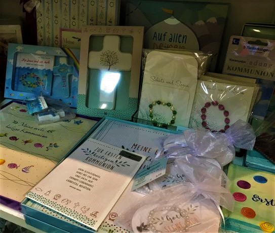 Wenn Sie noch Fragen haben kommen Sie gern bei uns vorbei. Wir beraten Sie auch rund um die passende Tischdeko samt Tischläufer und Servietten. Darüber hinaus führen wir ein breites Sortiment an Geschenkartikeln zum Thema Kommunion.