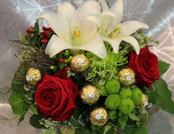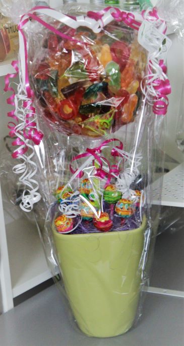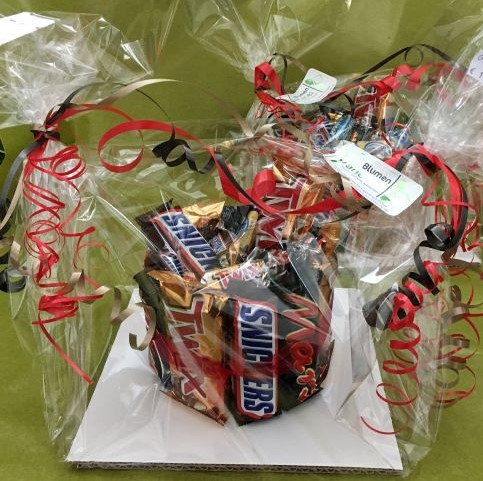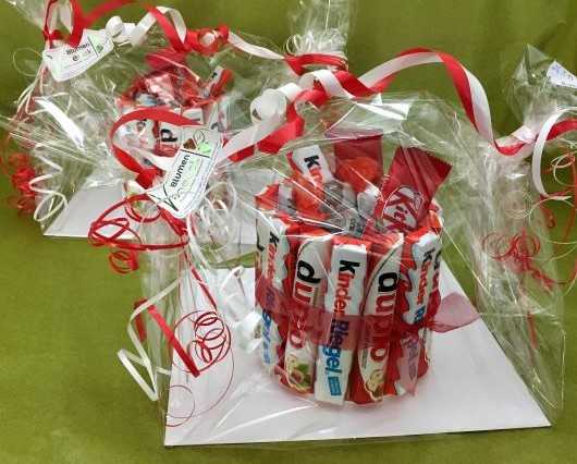 Kreativ, modern und originell – so sind Geschenke aus der Kategorie ,Sweet, sweeter…‘. Es gibt Torten in verschiedenen Größen, die mit Kinderriegel, Yogurette oder auch mit Mars, Snickers usw. gestaltet werden. Weiter können Sie Candy-Trees, mit unterschiedlichen Gummibärchensorten geschmückt, bestellen. Unser Lindor- und Rocher-Baum ist ebenfalls lecker und ein Hingucker zugleich. Mit Rocher-Kugeln lassen sich eine ganze Reihe von Motiven gestalten: Jahreszahlen, goldene Ringe, goldener Bilderrahmen oder auch ein goldenes Herz. Soll eine Lieblingssüßigkeit kreativ verschenkt werden? Sprechen Sie uns einfach an, wir versuchen Ihre Wünsche zu verwirklichen.